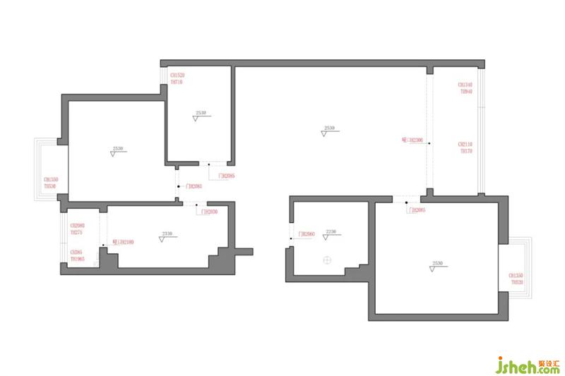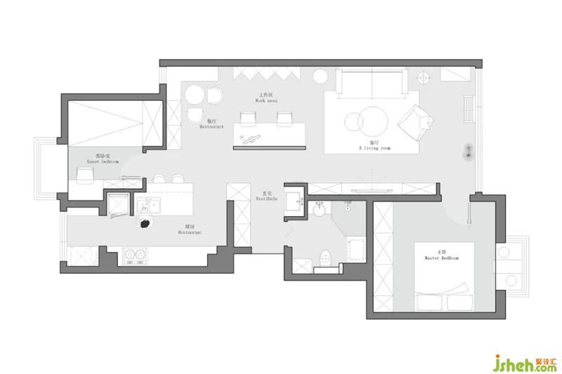 原始戶型的墻體結(jié)構(gòu)并不是都為承重墻,這為設(shè)計師的改造思路提供了更多的可能性??臻g整體的采光性很好,但是衛(wèi)生間是個暗衛(wèi),需要引入光線或是采用燈光照明。
