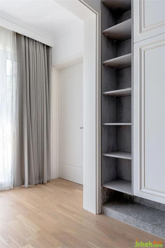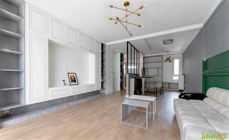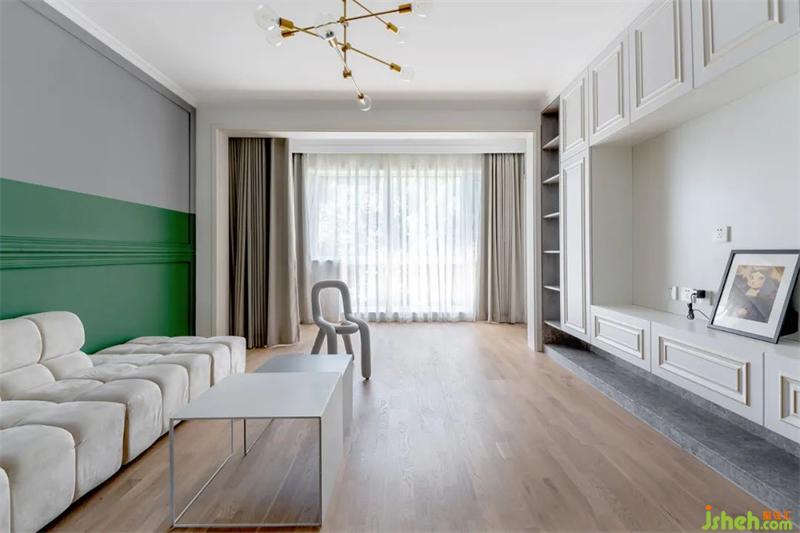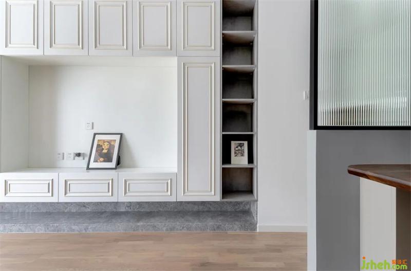 電視墻是組合柜的形式,灰色開放格搭配白色儲物柜,彰顯十足的復(fù)古風(fēng)味。柜門表面還做造型提升整體的層次感,底部在配上灰色石材石基,增添一絲別樣的韻味。