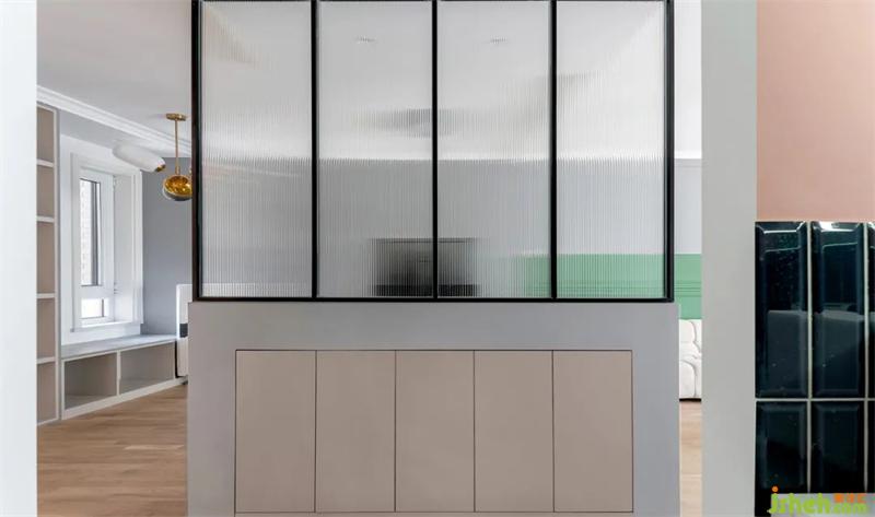 長虹玻璃+內(nèi)嵌柜組合而成的屏風(fēng)隔斷,完美的阻擋了門外的視線,避免一覽無余。長虹玻璃獨特波浪形紋理,又可以很好的營造一種朦朧的美感。