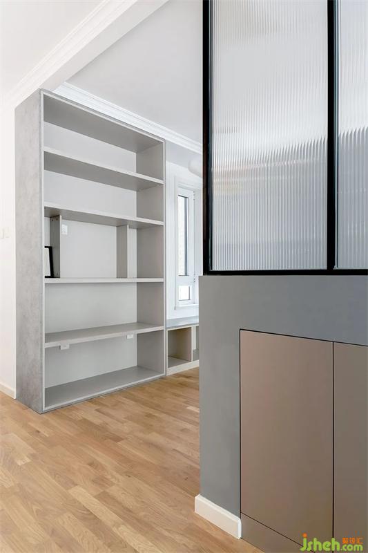 屏風隔斷的另一側是一組整高的書柜和餐廳區(qū)域,并利用窗下空間定制了開放格式的卡座,同時滿足就餐的上座率與收納空間,一舉兩得。