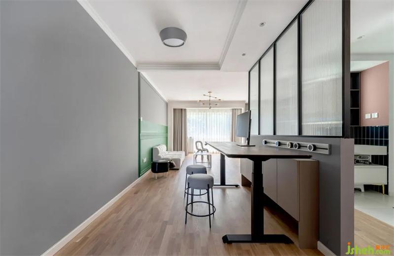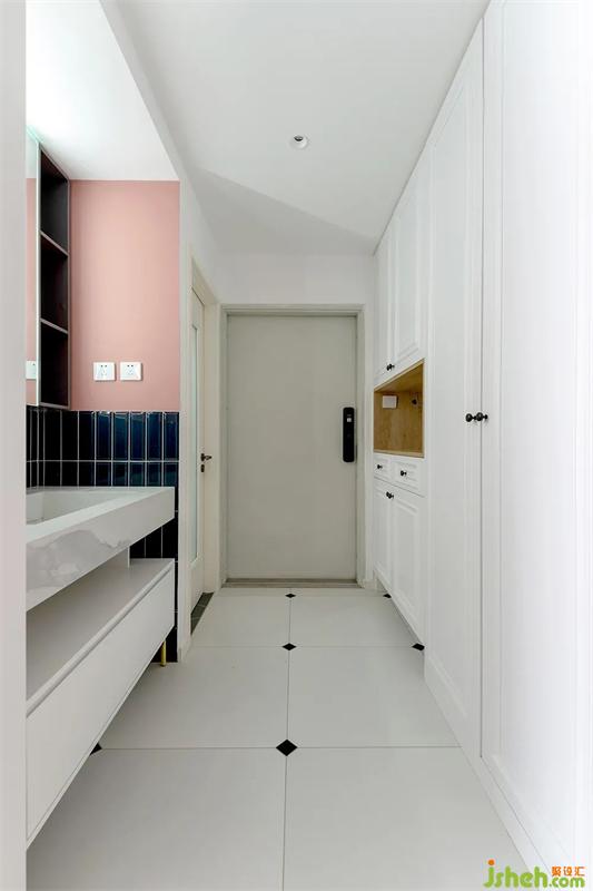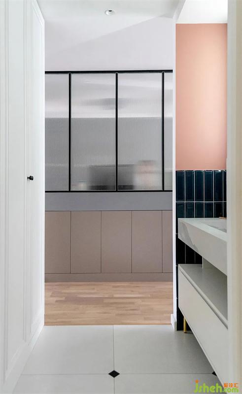 玄關一進來,迎面看見的就是長虹玻璃+隔斷柜組合而成的屏風,阻隔視線私密性拉滿。北京裝修設計左側是玄關收納柜,右側則是干濕分區(qū)外置洗手臺。