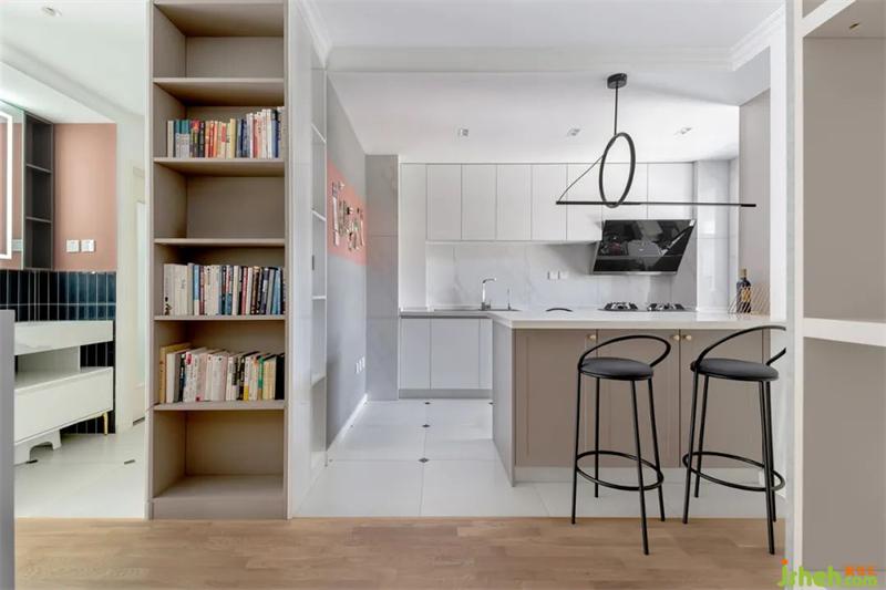 拆除了原本的墻體改造成開放式廚房,用一張寬度970mm獨立島臺過度。較高的吧椅可以有效提升入座的舒適度。側面是一組整高書柜迎接動線,讓整體過度更自然。
