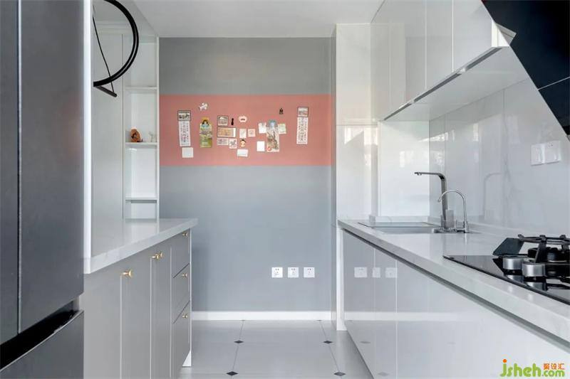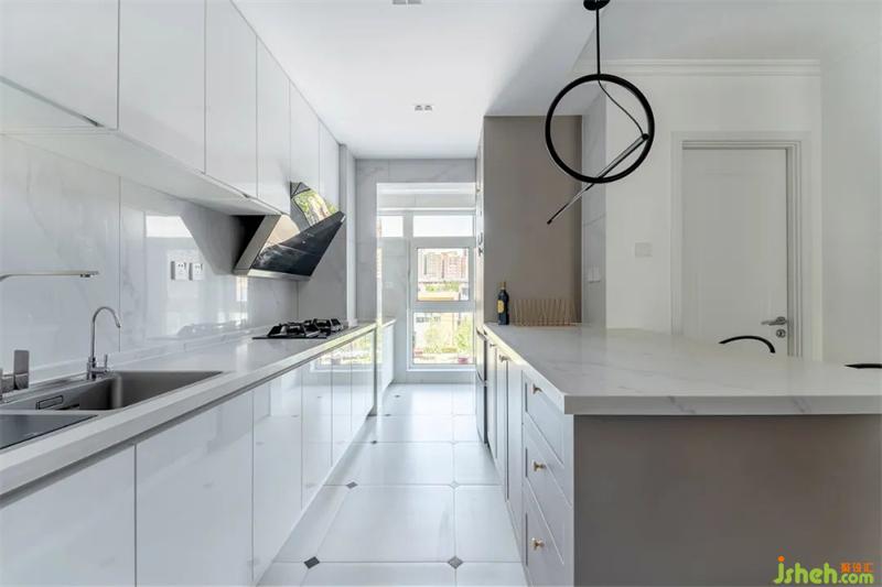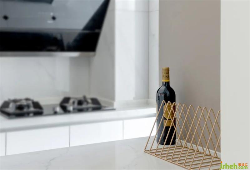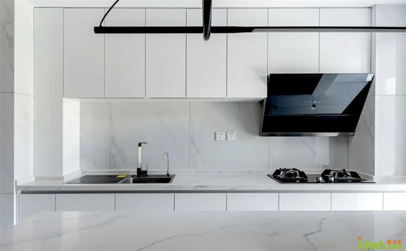 按壓式的柜門無把手,避免磕碰使用起來也更流暢。白色石材的臺面與墻面,搭配白色櫥柜,明亮的色調讓空間看起來更加寬敞潔凈。