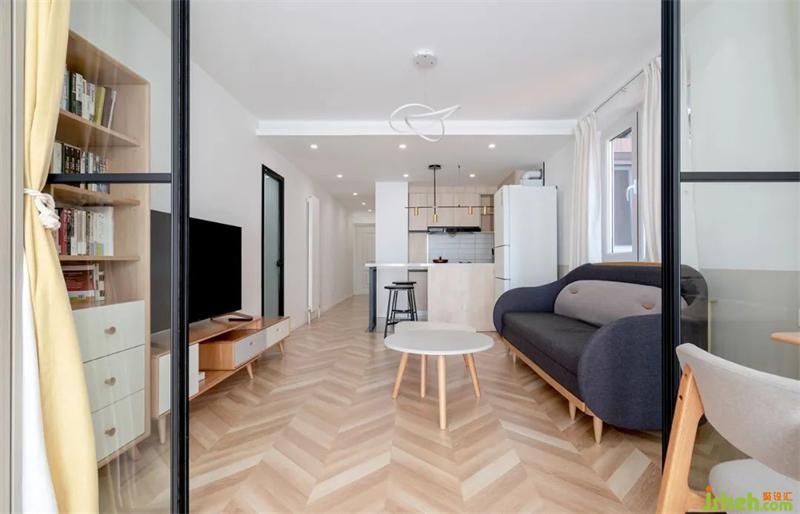 為了預(yù)防在廚房里操作時(shí),滴水弄濕地面,所以在材質(zhì)上形成區(qū)分。天津家居設(shè)計(jì)廚房區(qū)域是防水防滑的瓷磚,方便打理??蛷d部分則做了魚骨拼地板,提升裸腳舒適度。中間的黑色金屬條,做銜接,整齊美觀,有井有序。