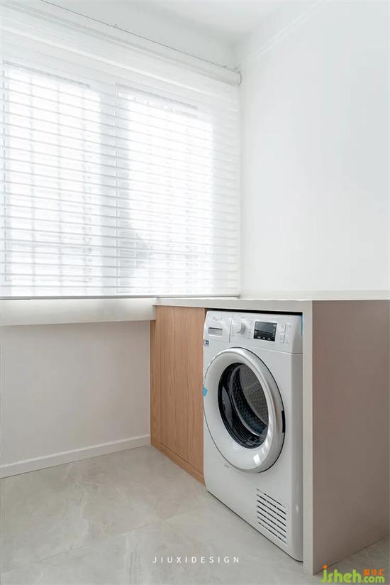 在南陽(yáng)臺(tái)增加了內(nèi)嵌式烘干機(jī),旁邊還有一組收納柜,上面可作為臺(tái)面用來(lái)熨燙,疊放衣服,增加了操作空間。