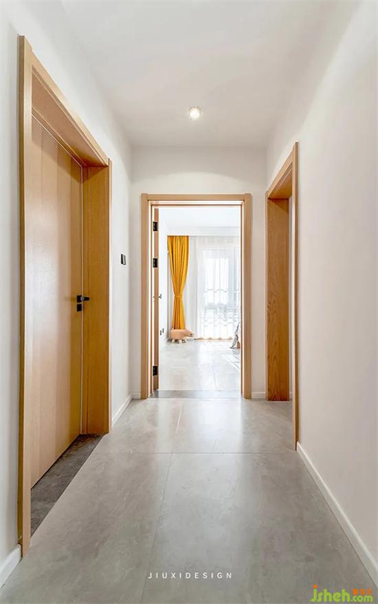 走廊空間干凈清爽,視裝修線通透。原木色的門(mén)保證隱私的同時(shí),溫暖了整個(gè)走廊空間。