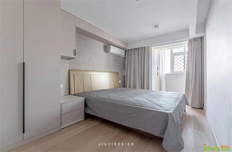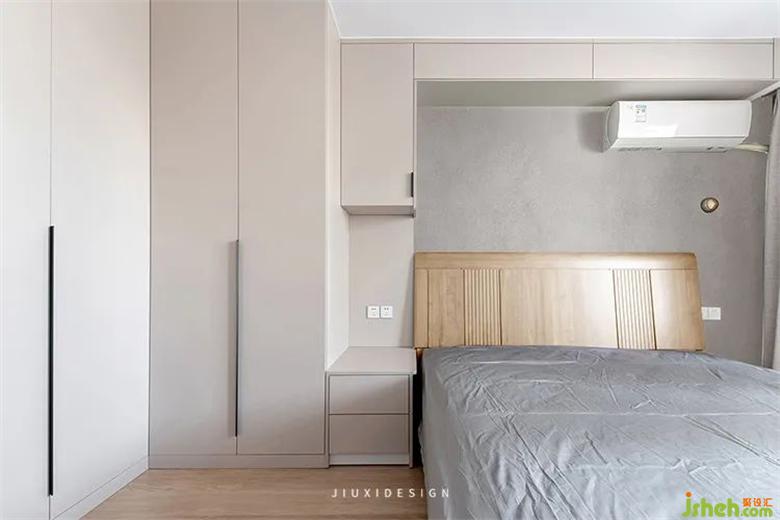 臥室采用了無主燈的設(shè)計(jì),頂部?jī)蓚€(gè)明裝筒燈來進(jìn)行整室內(nèi)設(shè)計(jì)師體照明。窗簾用色與家居協(xié)調(diào)統(tǒng)一,絲毫不跳出。床頭上方有一個(gè)比較明顯的橫管,屬于暖氣主管道,所以用柜體對(duì)它進(jìn)行了包裹,也具備一部分的儲(chǔ)物功能。
