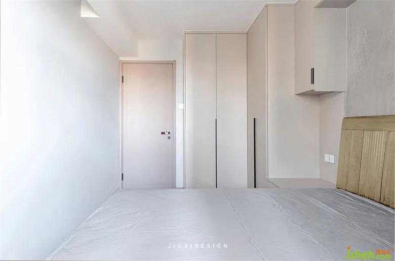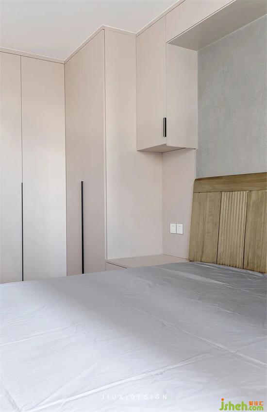 床頭右側(cè)有一個(gè)很小的紐扣壁燈,精致又實(shí)用。左側(cè)是一排L型衣柜,讓整個(gè)臥室的一干收納有了保障。床頭墻斑駁的水泥漆效果,提升臥室空間的質(zhì)感。
