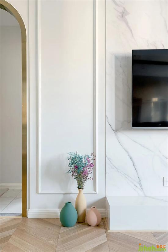 金色的門套搭配石膏線,配上爵士白石材,簡(jiǎn)單的輕奢風(fēng)也不會(huì)顯得太過(guò)復(fù)雜。重點(diǎn)要說(shuō)的是這個(gè)拱形門洞,完成這樣的窄門套,對(duì)木工工藝要求度要高,需要達(dá)到完成面都是齊平的標(biāo)準(zhǔn)。