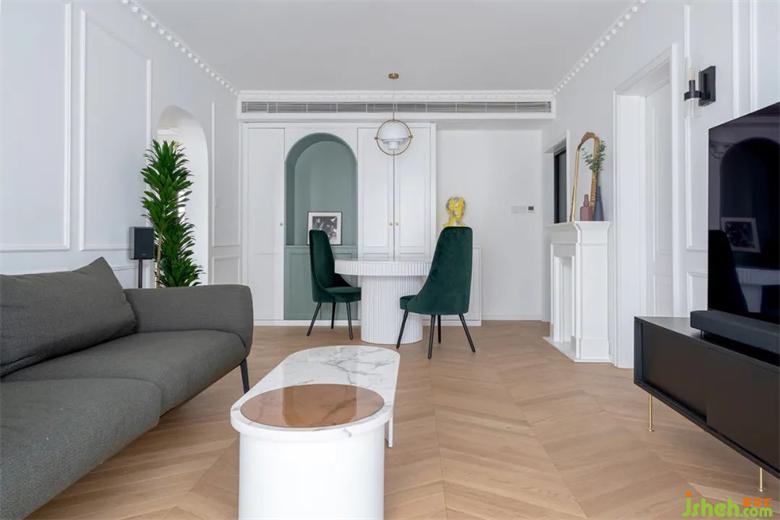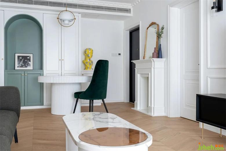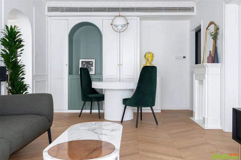在白色的儲(chǔ)物柜中,內(nèi)嵌入了牛油果綠的餐邊格,裝修打破常規(guī)增強(qiáng)視覺(jué)感受,圓形的餐桌讓動(dòng)線更流暢。