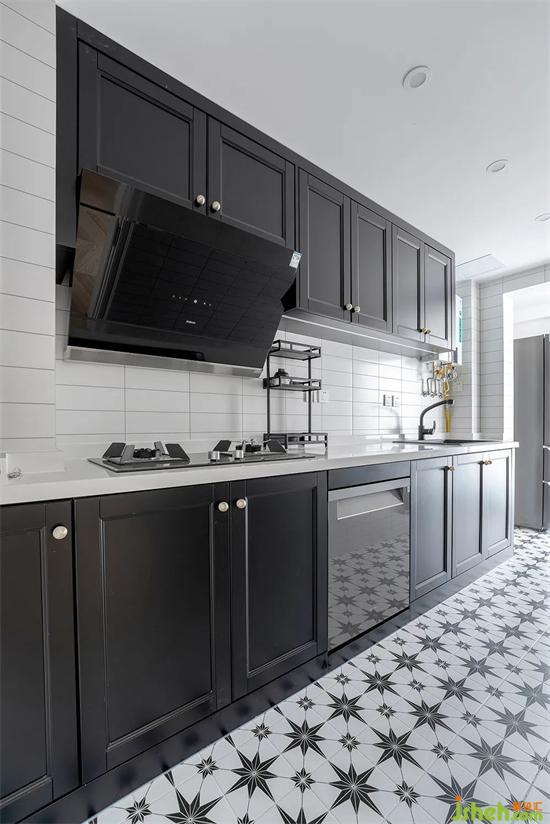 廚房選用了深色的柜體,黃銅把手與深顏色的柜體相得益彰。廚房頂面用了防水石膏板和筒燈的結(jié)合,柜體內(nèi)嵌洗碗機(jī),裝修徹底解除洗碗的煩惱,200*200的花磚,讓復(fù)古中帶有幾分俏皮。