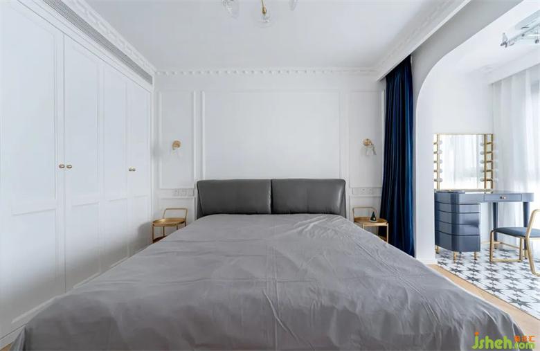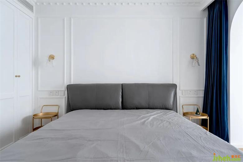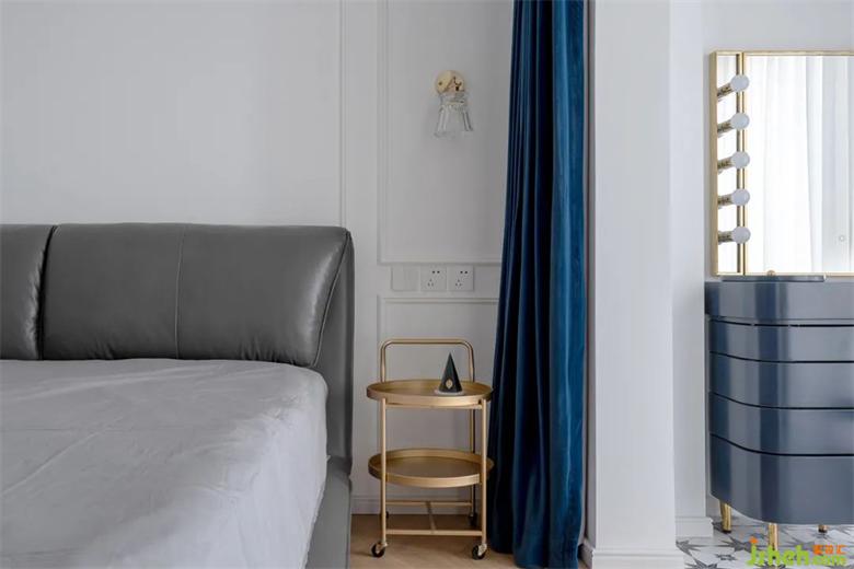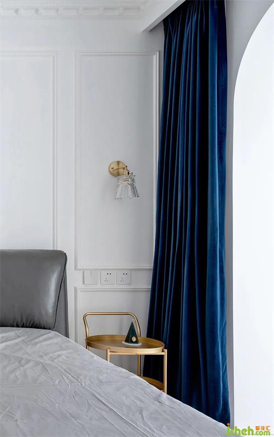 床頭旁選用了可靈活推拉的盤式儲(chǔ)物,拉絲黃銅的質(zhì)感+深藍(lán)色的窗簾組合高級感十足。