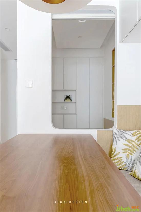 2.主臥的改動后,正好利用門后區(qū)域,做了大面積的通體衣柜,床也是采用了地臺形式,增加收納也提升空間利用 。