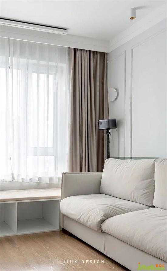 客廳作為備用臥室,選擇了一款淺色的沙發(fā)床,來客人時(shí)輕輕拉開就切換成一張舒適的床。