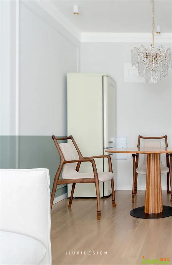 餐廳與客廳的造型相呼應(yīng),胡桃木質(zhì)的餐桌椅,搭配水晶吊燈和奶油色的小冰箱,透露出家的輕松。