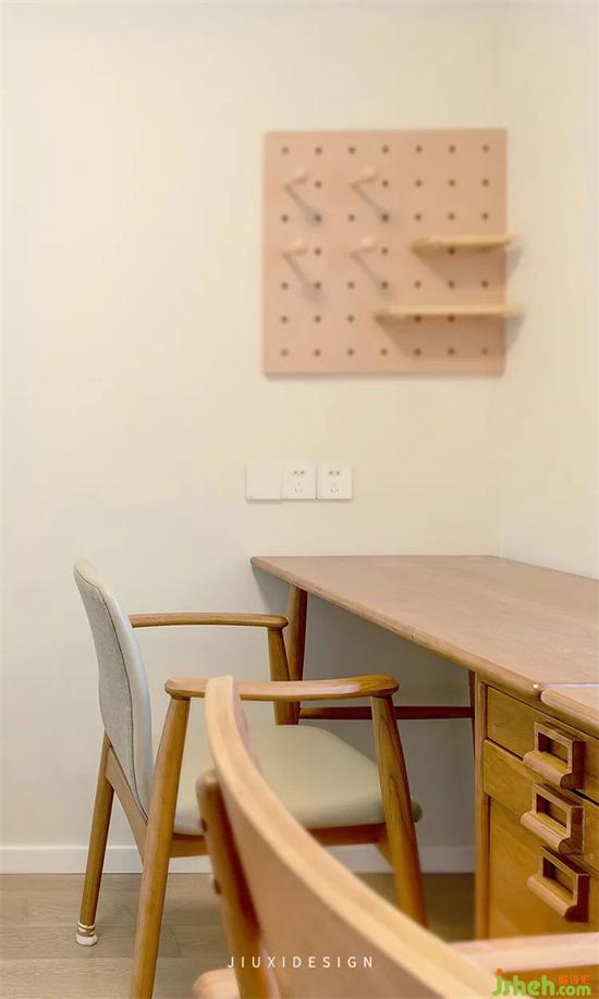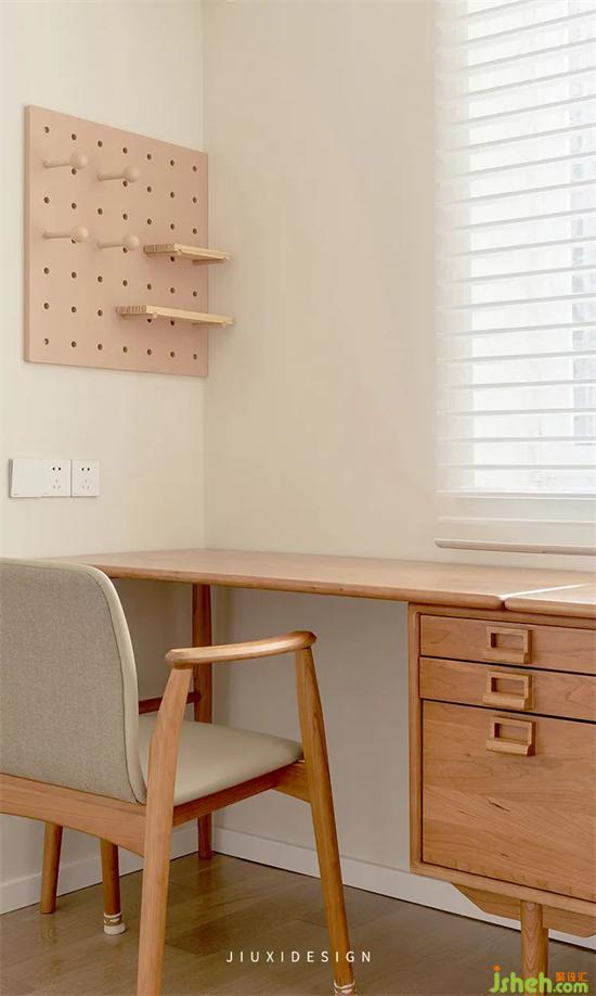 陽光透過百葉窗,灑在書的篇章之上,自由與想象,裝修設(shè)計給內(nèi)心世界創(chuàng)造一個棲居的場所。書房的布置以簡潔舒適為主,墻面的杏子灰加上原木色的洞洞板,別有一番風(fēng)味。每件小的裝飾品,都是結(jié)合家里的整體色調(diào)去選擇,柔和而溫暖。