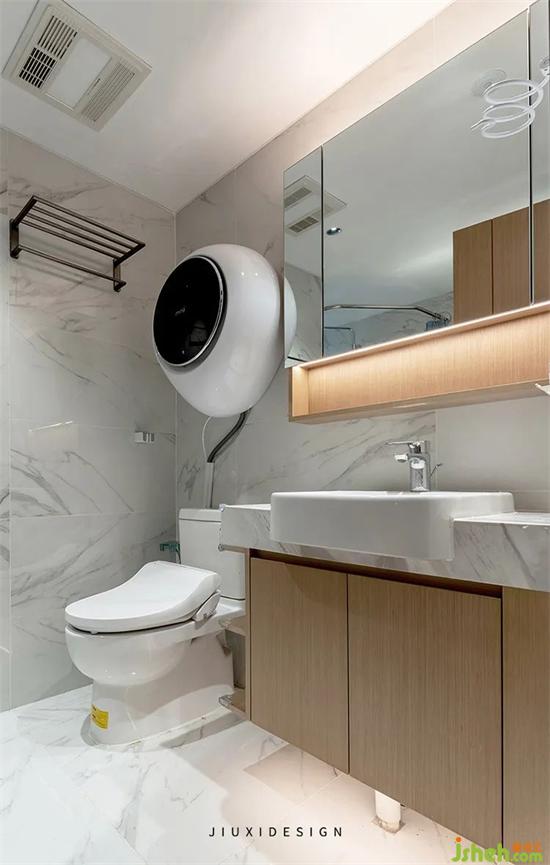 衛(wèi)生間的格局并沒有變動,為了更好的使用,增加了智能馬桶蓋及壁掛洗衣機(jī)。給拖把,毛巾,澡盆收納等規(guī)劃了相應(yīng)的位置。