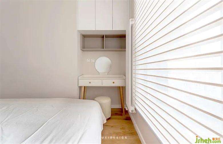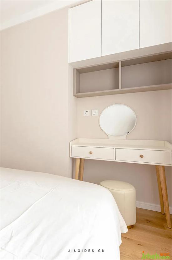 由于主臥與其他空間的隔墻,有一部分是承重結(jié)構(gòu)不能改動(dòng)。所以在位移改動(dòng)的墻體上,裝修形成了一個(gè)凹角區(qū)域,正好滿足梳妝臺(tái)的擺放。