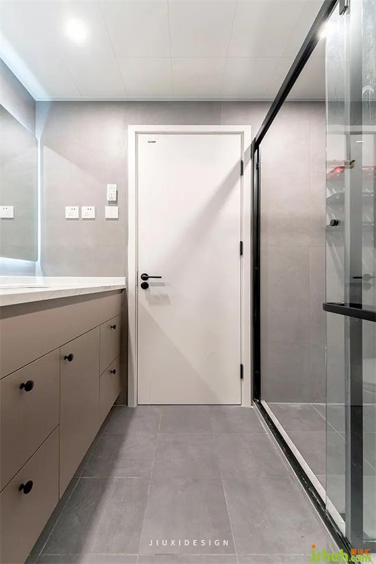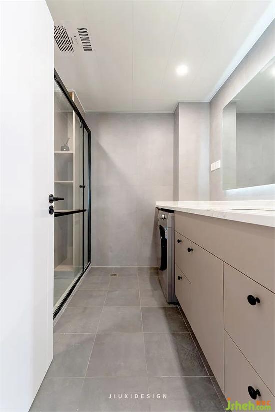 衛(wèi)生間的墻地面使用灰色啞光磚,讓空間完整簡單。裝修定制的浴室柜與墻面嚴(yán)絲合縫,不會(huì)有一絲絲的空間浪費(fèi)。