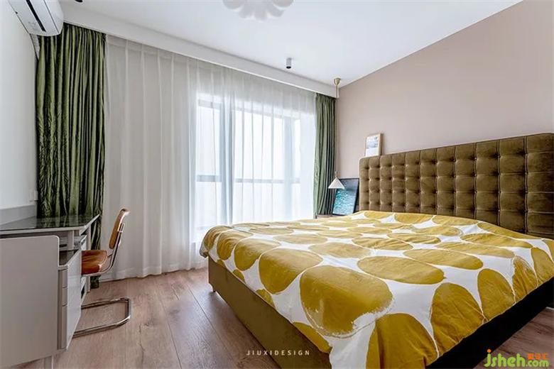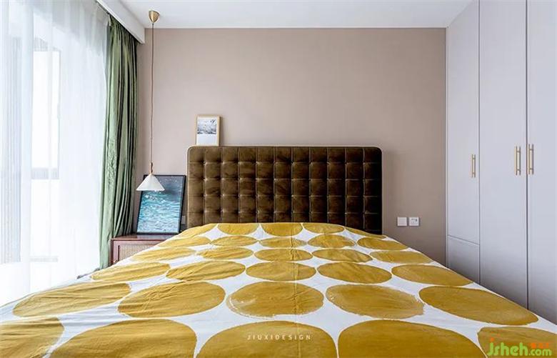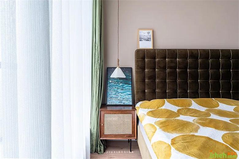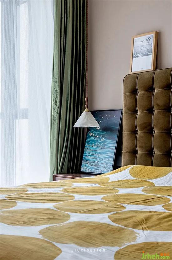主臥布萊肯棕背景搭配墨綠色窗簾,低調(diào)又不失柔美。再配以飄逸的紗簾,給予人溫暖安謐的視覺感受。番茄家的黎草色方格拉扣款布藝床,與圓形暖色床品相搭配,室內(nèi)設(shè)計(jì)師打造舒適溫馨的氛圍。