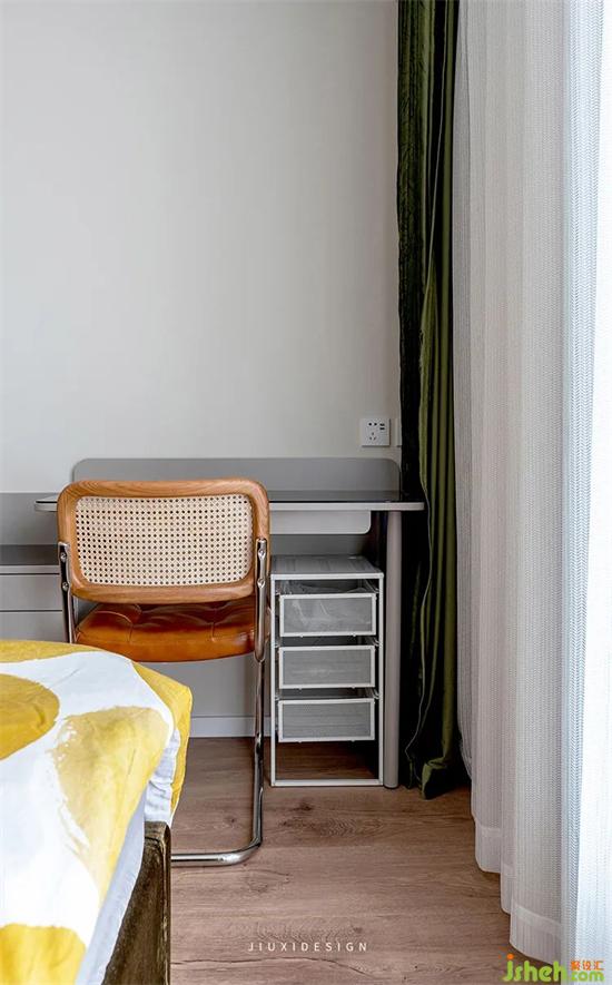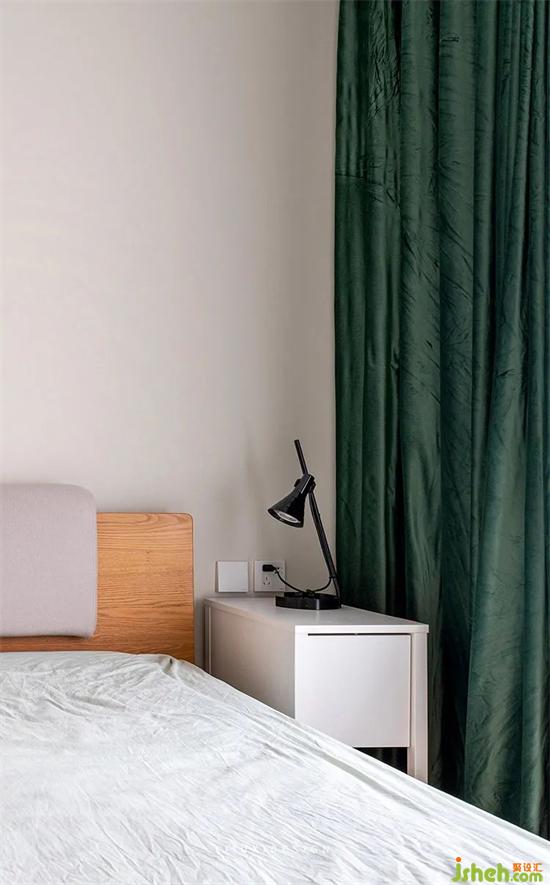 在木色床頭與復(fù)古綠窗簾之間,搭配一個(gè)小面積的白色床頭柜和黑色的小臺(tái)燈,降低顏色的沖擊感,且小巧而實(shí)用。