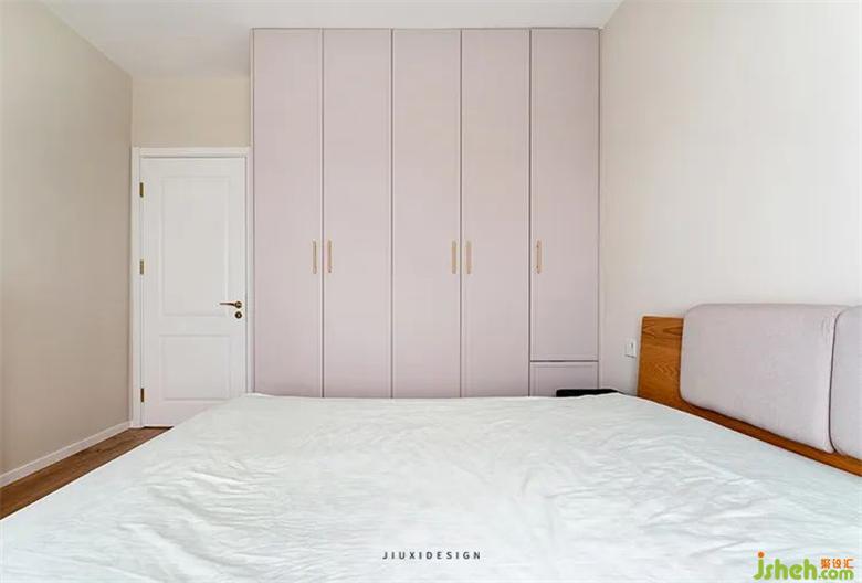 床頭和地板采用同色系,柜子和床頭軟包采用同色系。室內(nèi)設(shè)計(jì)師墻面是暖色的溫馨,床品是弱冷的素凈雅致。內(nèi)在相互聯(lián)系,相互呼應(yīng),連接成了一個(gè)整體,形成一種全放松的空間。