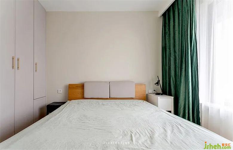 次臥強(qiáng)調(diào)安靜自在的舒緩感,大面積使用杏子灰,室內(nèi)設(shè)計(jì)師搭配自然氣息的復(fù)古綠窗簾。原木結(jié)合布藝的床頭混合設(shè)計(jì),舒緩整個(gè)空間,并帶有一絲生機(jī)與從容感。