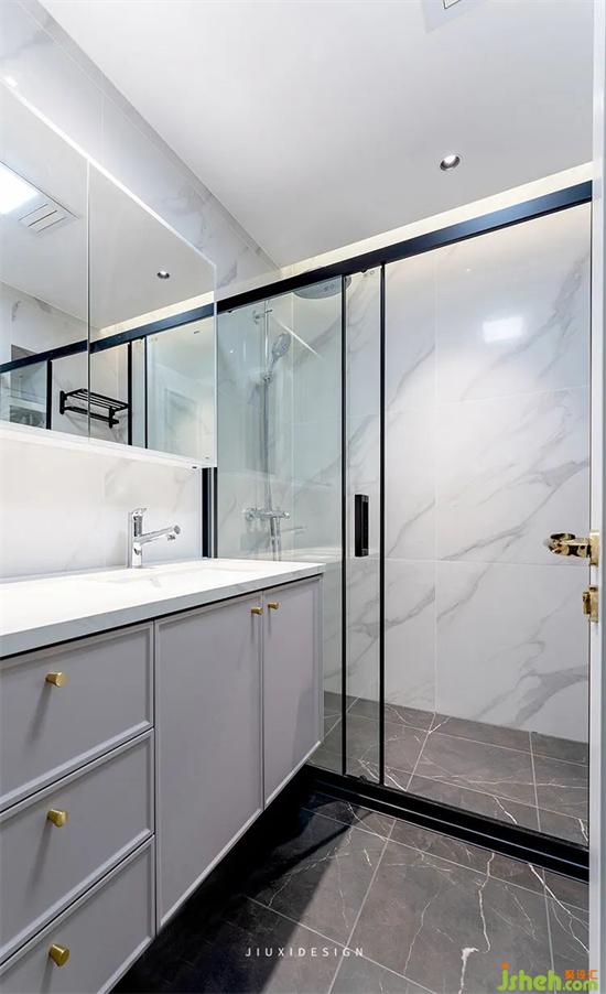 沉穩(wěn)的深灰色石材地磚,搭配清爽的白色墻面,室內(nèi)設(shè)計(jì)師拉開(kāi)空間的層次,清爽而有力量。略帶復(fù)古的淺灰色浴室柜,既是明度的階梯,也是呼應(yīng)復(fù)古氣質(zhì)的點(diǎn)睛之筆,讓整個(gè)空間清爽中更加溫柔。浴室柜的吊柜的形式,不僅方便清潔,還讓空室內(nèi)設(shè)計(jì)師間顯得輕盈。下面暗藏了起夜燈,方便夜晚使用。大面的鏡柜擁有不可小覷的收納實(shí)力,在側(cè)墻設(shè)置了毛巾?xiàng)U,減輕臺(tái)上負(fù)擔(dān)。