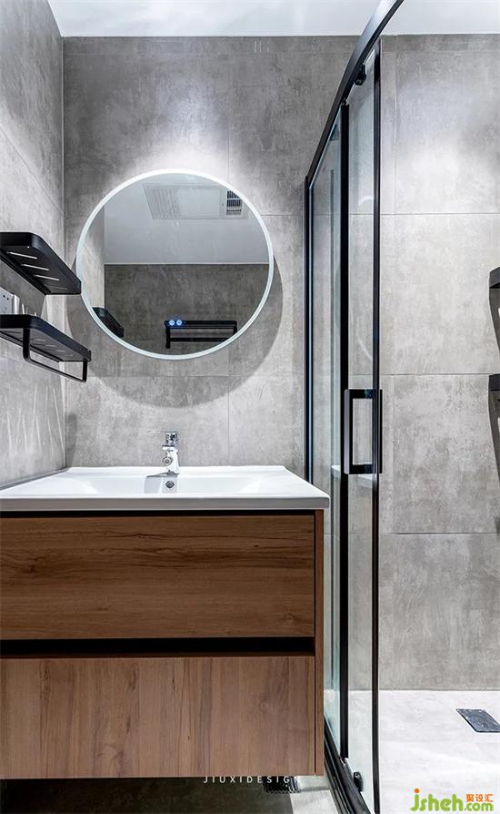浴室柜側(cè)墻設(shè)置了收納架,搭配簡(jiǎn)約的圓鏡,室內(nèi)設(shè)計(jì)師保持了現(xiàn)代感,又給空間增加了一份柔和。浴室柜懸空,既保證了視覺(jué)的輕盈感,不留死角,減輕家務(wù)負(fù)擔(dān),時(shí)刻保持干凈清爽的狀態(tài)。