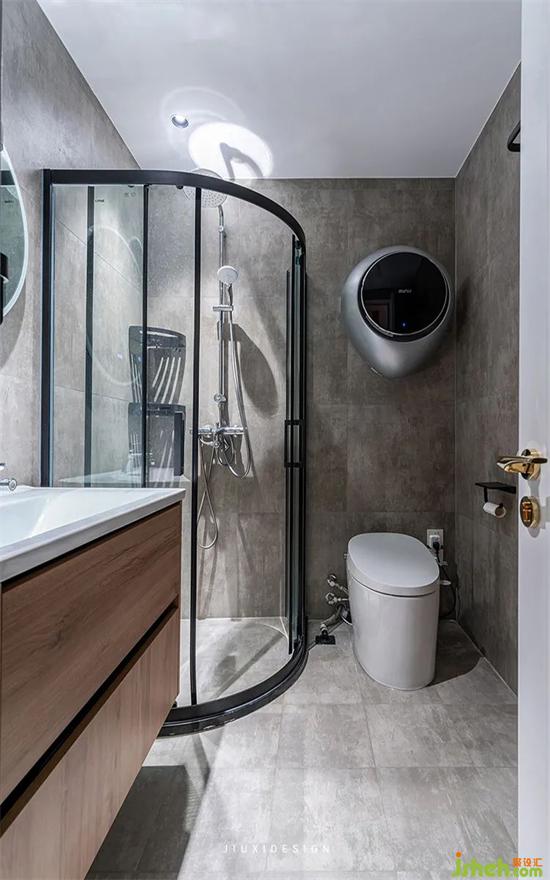 獨(dú)立的淋浴房墻面內(nèi)凹了三個(gè)壁龕,滿足大量收納的,整潔耐用,清理非常方便。馬桶選用的是壁掛馬桶,沒(méi)有任何死角,方便清潔衛(wèi)生。次衛(wèi)采用高級(jí)灰的配色,整體的水泥質(zhì)感,塑造干練而整潔的基底。浴室柜原木色,室內(nèi)設(shè)計(jì)師給空間以自然的溫暖質(zhì)感。在功能上,智能馬桶的水箱,上方的壁掛洗衣機(jī)的管線等,也都進(jìn)行了暗藏處理。