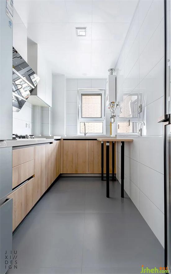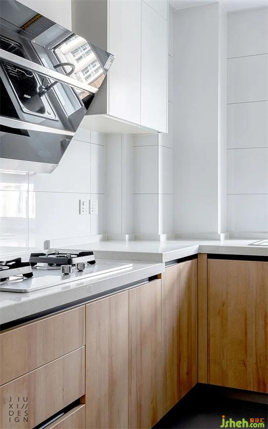 櫥柜選用暗藏把手,避免使用當(dāng)中受到磕碰。臺面設(shè)計(jì)了高低臺,讓清洗和配菜區(qū)更高一些,這樣不裝修設(shè)計(jì)用彎腰太多。燒菜因?yàn)橛绣伒母叨龋耘_面低一些會比較順手。