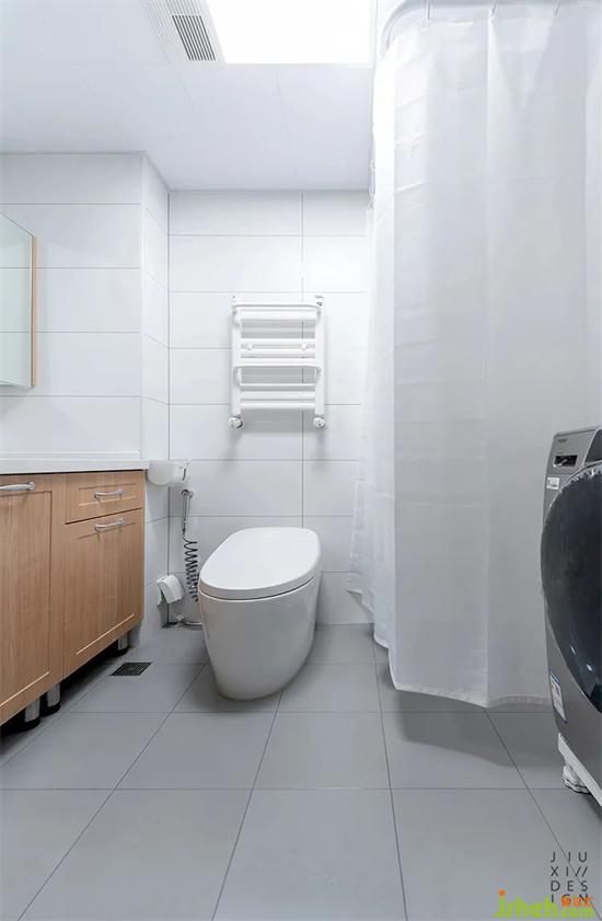 簡單的灰白搭配,加上木色手盆柜,日式感依然存在。淋浴區(qū)沒有做成封閉式裝修設(shè)計(jì),而且面積也小。考慮到提高老人使用的便捷性,浴簾會更方便出入,也不會顯得局促。