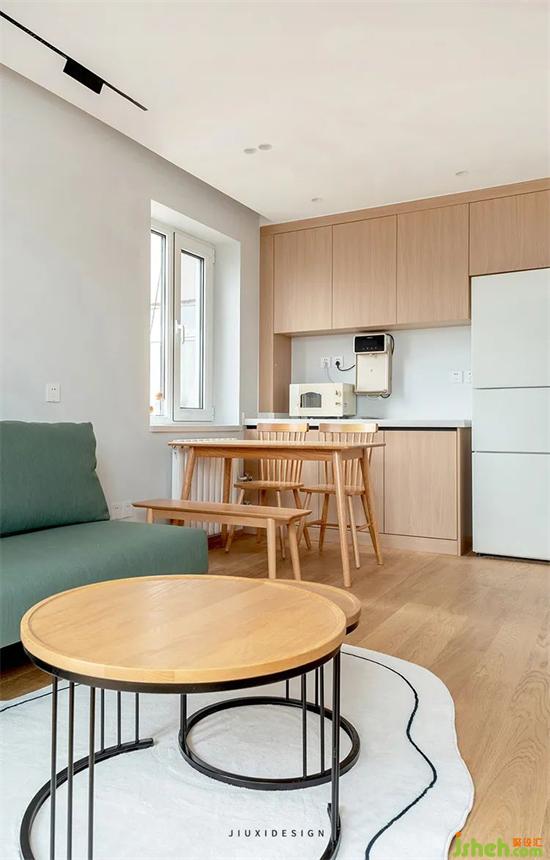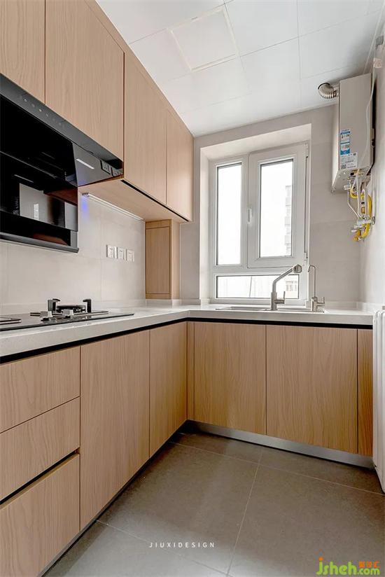 廚房整體以原木和灰色磚為主,干凈整潔。室內(nèi)設(shè)計師為了達(dá)到整體結(jié)室內(nèi)設(shè)計師構(gòu)統(tǒng)一,下水也用板式家具包覆隱藏,同時預(yù)留了可以開啟的檢修口,將細(xì)節(jié)感拉滿。