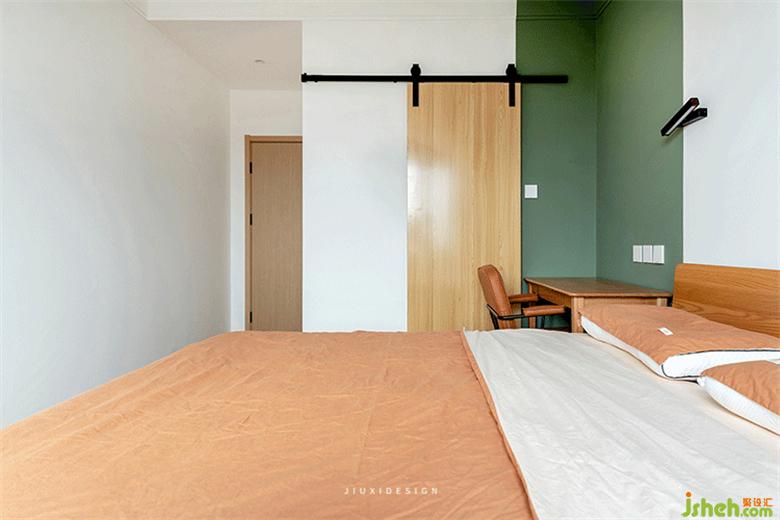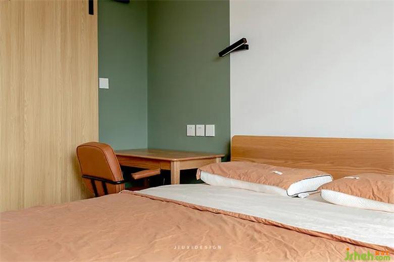 由于屋主有在家偶爾室內(nèi)設(shè)計師辦公的需求,在床頭增加了辦公區(qū),床品和椅子的配色,統(tǒng)一空間色調(diào),擁有變化還不失單調(diào)。