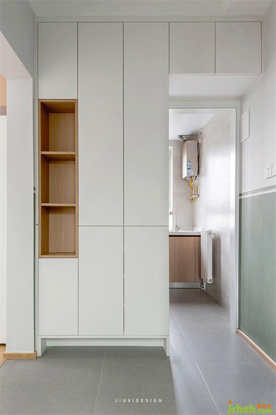 縮小廚房空間,新增加的玄關(guān)儲物柜,滿足日常的食用儲備。原來在廚房暴露出來,縱橫交錯的一堆室內(nèi)設(shè)計師管道,正好可以通過玄關(guān)柜將其全部隱藏。