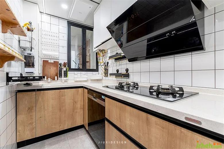 讓出陽(yáng)臺(tái)的廚房,弱化了動(dòng)線的狹長(zhǎng)感,裝修設(shè)計(jì)將門(mén)改造成室內(nèi)窗,保留了原有的采光與通風(fēng)效果。