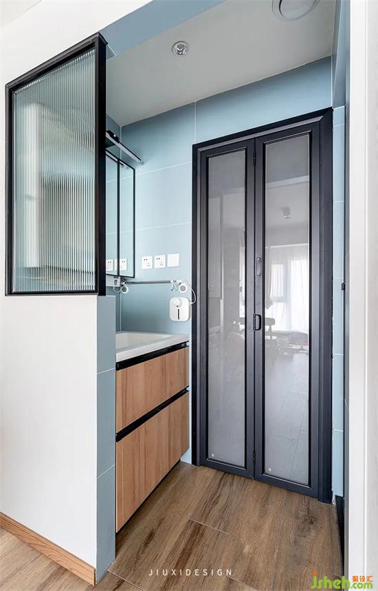 洗漱區(qū)挪移到了衛(wèi)生間門(mén)外,半墻+長(zhǎng)虹玻璃隔斷的組合,既可以形成遮擋,又不會(huì)遮擋采光。