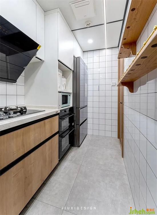 右側(cè)墻面還增加金屬洞洞板和雙層隔板,隔板是木即木作的定制款,可以用于一些干貨,粗糧的存放儲(chǔ)備。