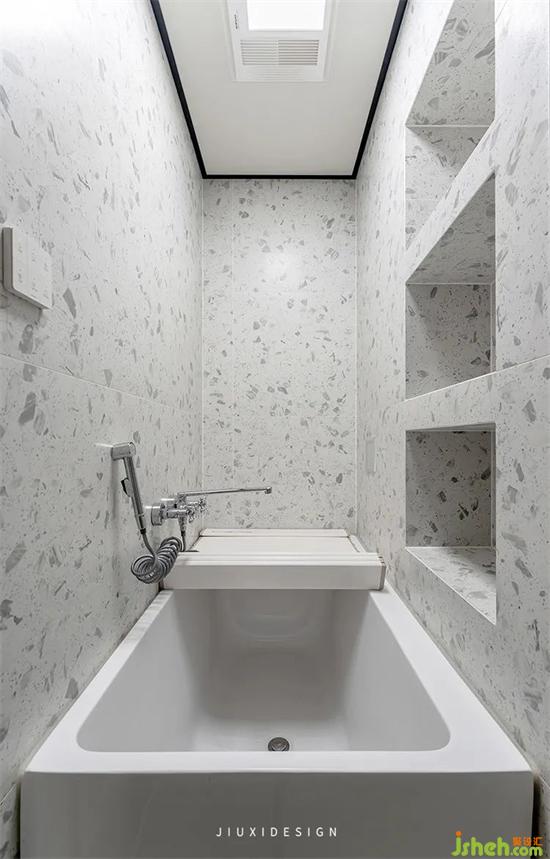 浴缸右側(cè)還利用管道延伸做了壁龕,日常存放洗浴用品拿取更加方便。長(zhǎng)1.3m寬75cm的浴缸,上面還加裝了抽拉式的蓋子。不僅可以防止落灰,還能當(dāng)作置物架,可以邊泡澡邊追劇。