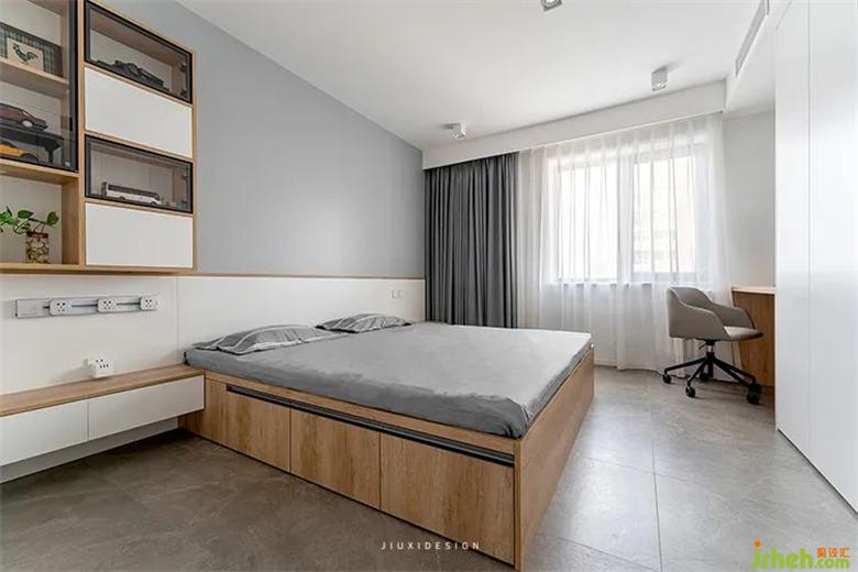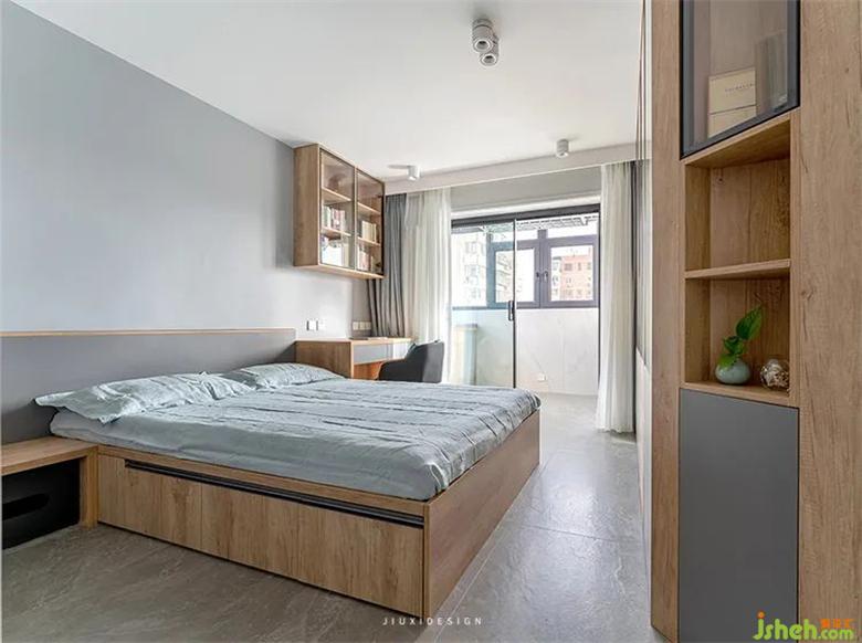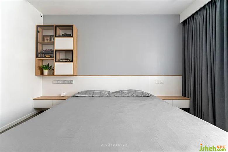 主臥沒(méi)有多余的裝飾,極簡(jiǎn)的墻面、衣柜和無(wú)靠背床都非常符合簡(jiǎn)約的調(diào)性??臻g中既有俐落平衡的線條,冷靜的灰色,也有紋理自然的木紋,室內(nèi)設(shè)計(jì)為空間中和溫度。增加自然質(zhì)感,視覺(jué)上也得到了平衡和安室內(nèi)設(shè)計(jì)定。