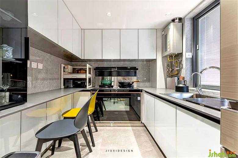 我們將空間重新調(diào)整,獲得了一個(gè)u字型的廚房空間,室內(nèi)設(shè)計(jì)并把早餐區(qū)直接放置在了廚房空間,更加方便和高效。邊制作美食,且邊吃邊聊,更能體現(xiàn)煙火味的生活氣息。沉穩(wěn)的深灰色系調(diào)磚為基底,與不銹鋼白色亮光和灰色巖板,調(diào)和出現(xiàn)代的內(nèi)斂室內(nèi)設(shè)計(jì)質(zhì)感。柜內(nèi)崁入水槽洗碗機(jī),集成灶等設(shè)備。