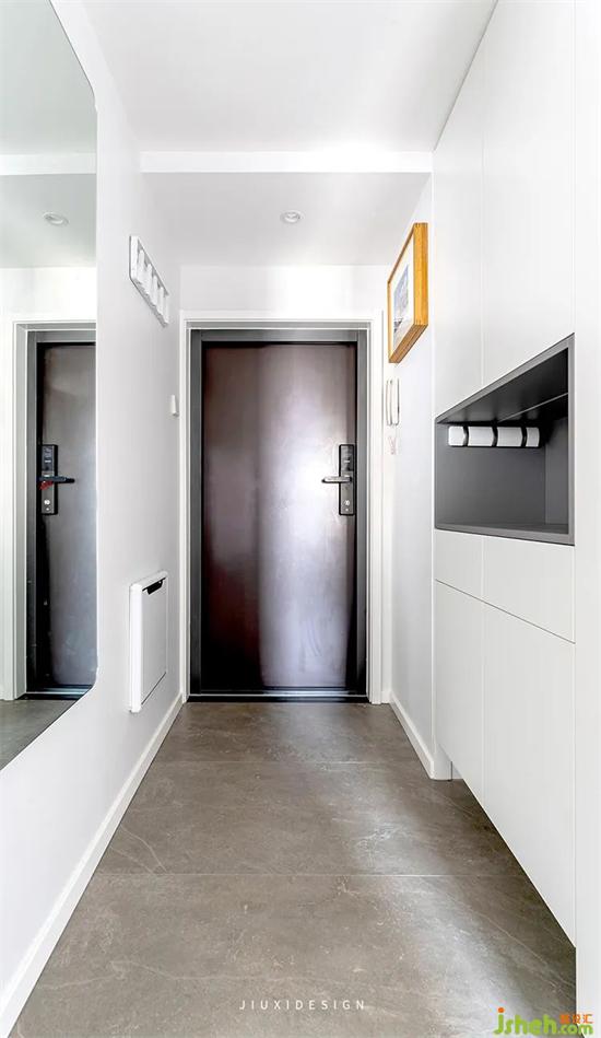 入戶(hù)的位置規(guī)劃了換鞋凳,掛衣區(qū),鏡子和鞋柜位置。鞋柜區(qū)域預(yù)留了開(kāi)放格和抽屜,放置小件物品,同時(shí)也可以處理不用扔掉的口罩。室內(nèi)設(shè)計(jì)整體色調(diào)通過(guò)明朗色塊的墻頂和地分開(kāi),形成明暗變化。走進(jìn)入戶(hù)空間的第一感,一種簡(jiǎn)約舒適感迎面而來(lái)。