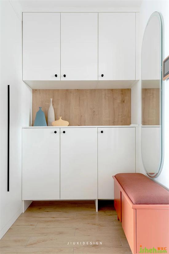 入戶門廳位置,增加玄關(guān)收納和穿衣鏡,室內(nèi)裝修為出入的整理和收納提供便利。整個色彩體現(xiàn)出家的第一印象,溫暖自然中增加一些活力和調(diào)性。