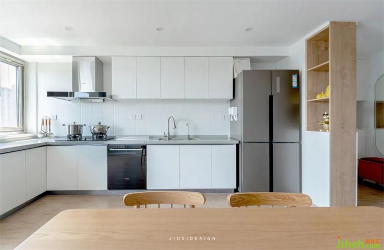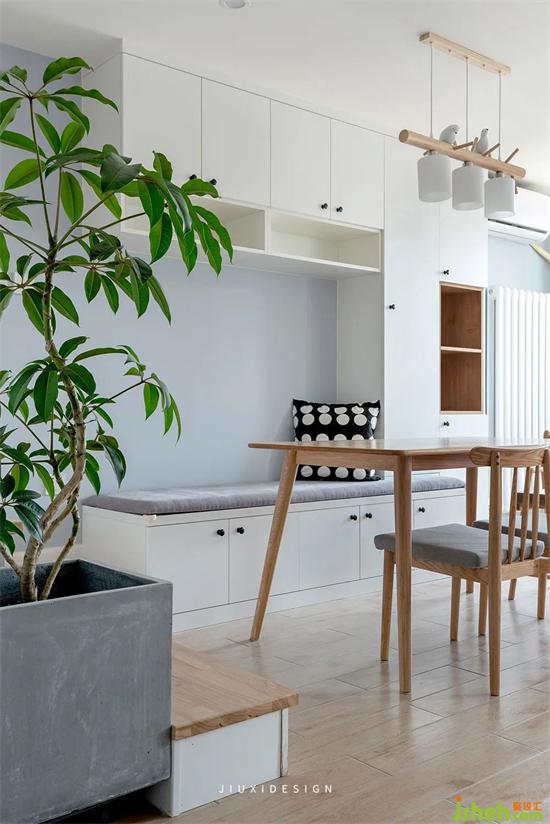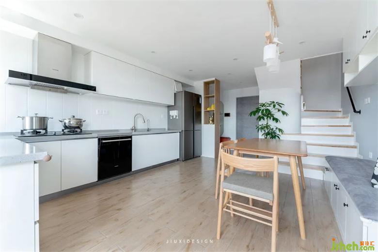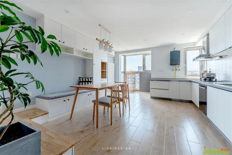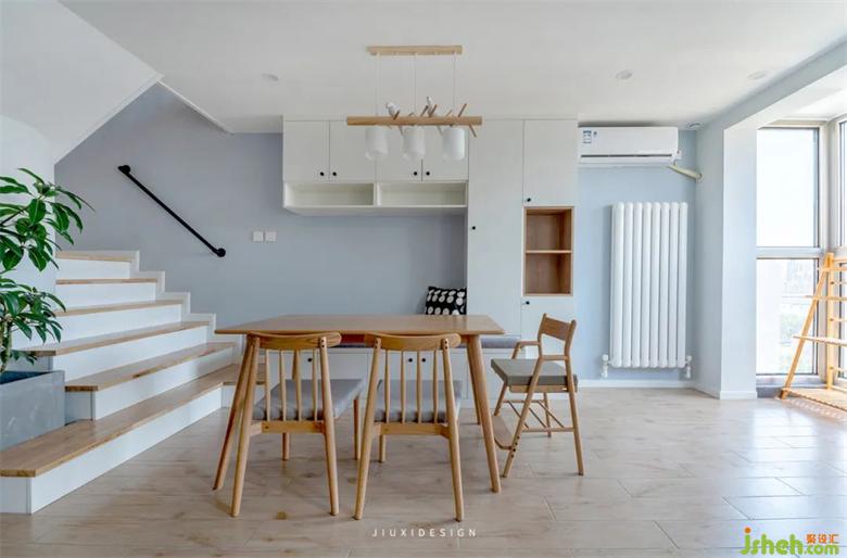 餐廚一體,是家室內(nèi)裝修的第二生活區(qū),實用又簡單。實木家具與純白色定制柜結(jié)合,在煙藍(lán)色的背景下,最有自然的味道。