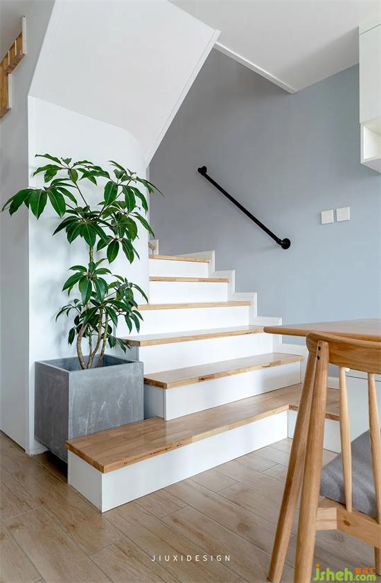 樓梯的下面則是一個小型的儲物間,因為同時是門廳區(qū)域,儲物間里還可以直接放進一部兒童車,以及換季電器等物品。為整屋的整潔,做好絕對的后勤工作。樓梯與樓板之間,用木格柵做好防護。安全的前提下,通風(fēng)室內(nèi)裝修和光影也能隨處交互。樓梯與儲物室之間,嵌入了水泥質(zhì)感的花盆與綠植。在踏步的平面和立面,做了分色處理。平衡色彩與質(zhì)感,讓空間更有節(jié)奏與生機。