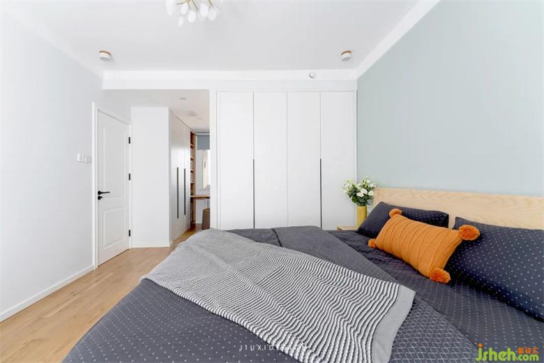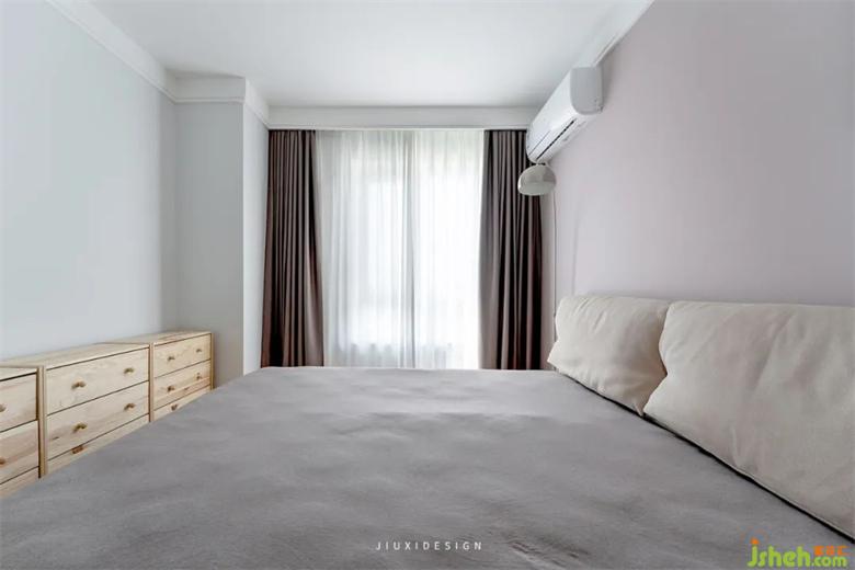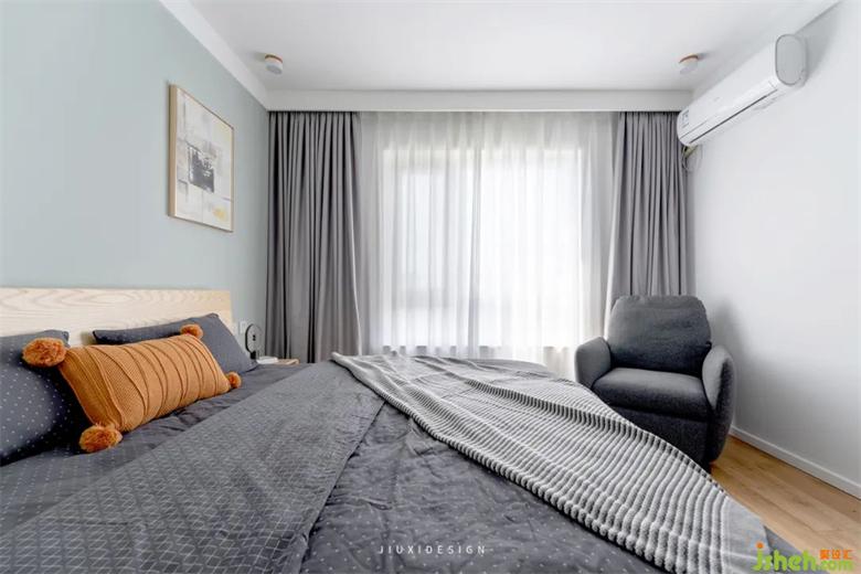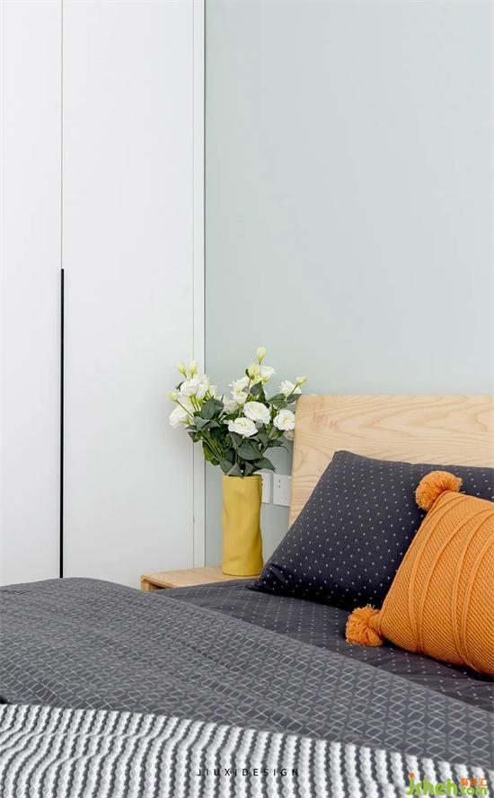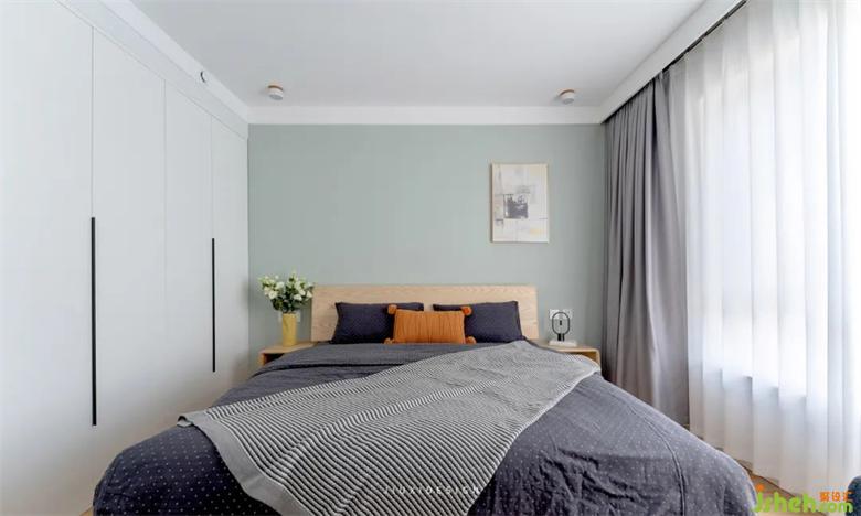 主臥以豆蔻青和白色為背景色,淺色調(diào)的原木床和床頭柜,室內(nèi)裝修讓臥室空間更接近自然,舒適具有溫度。床品的深灰色和窗簾淺灰,形成空間的明度架構(gòu),靜謐安逸中有了層次變化。
