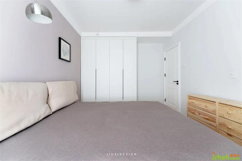 臥室地板和霜雪白墻面,純白色的柜子,室內(nèi)裝修營造出柔和靜謐的休憩氛圍。