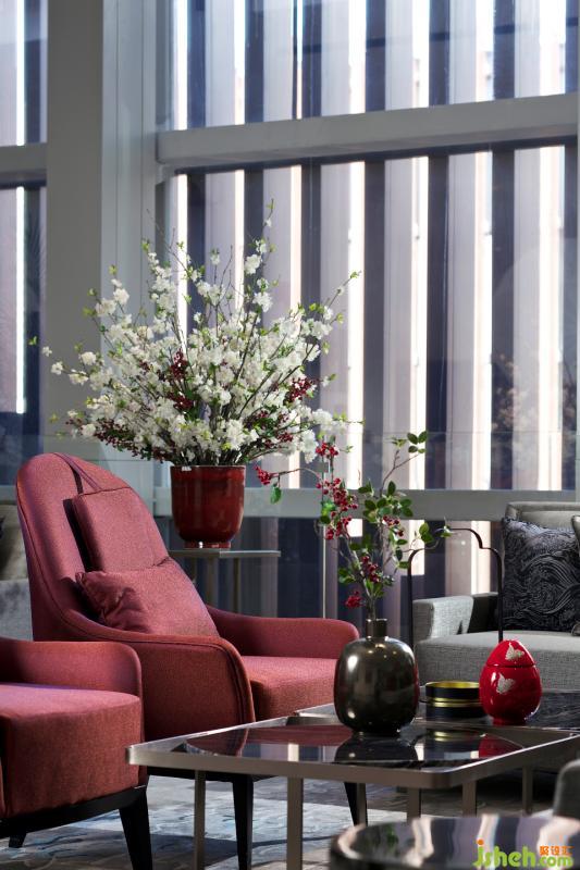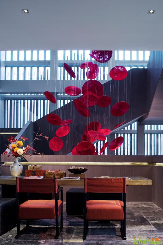 設計以結合唐山絲綢之路及唐朝貴族團扇文化為設計元素,設計的紅色吊飾,表達出吉祥貴族氣質(zhì)。陽光透過玻璃窗,讓光線在空間里若有似無的流動,虛實相間里給予洽談者一種全新的感官體驗。掛飾上的肌理為視覺與觸覺帶來記憶,也為觀者帶來遐想:亦或朝暉,亦或晚霞。設計公司