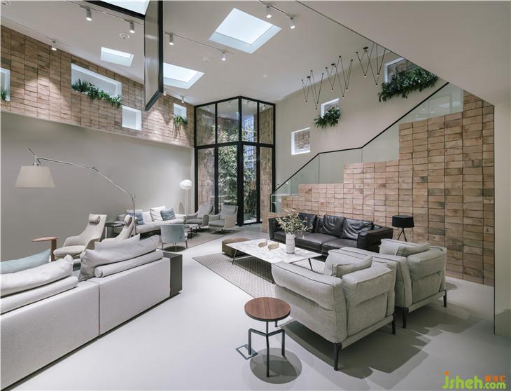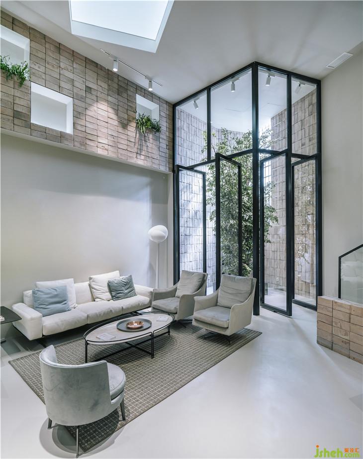 穿過這些金屬條,我們會遇到一個7m高的大空間,這個空間由鋼鐵和玻璃結(jié)構(gòu)組成,入口處設(shè)有一棵大樹,通過自然光線的照射使得入口處別有一番風(fēng)味。