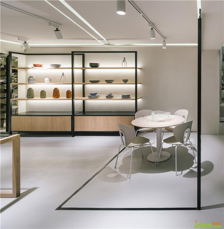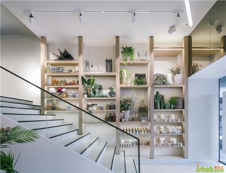 當(dāng)你一進(jìn)入室內(nèi),映入眼簾的是一個由用橡木支撐的架子。這些木制結(jié)構(gòu)以一種溫暖的方式歡迎客戶,展示了從小配件到家具的不同類型的物品的選擇。